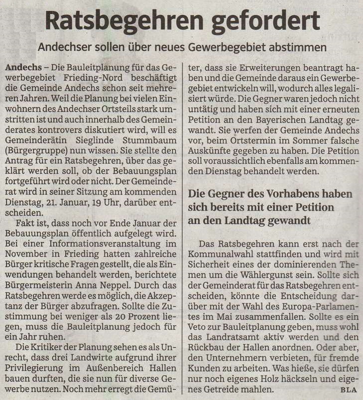 Kreisbote vom 20.12.2014 - Diskussion über geplantes Gewerbegebiet Frieding Nord