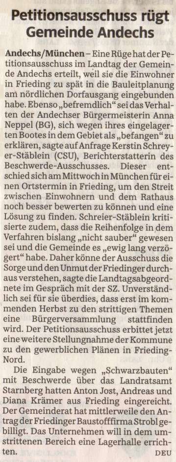 Süddeutsche Zeitung vom 12.07.2012 - Petitionsausschuss rügt Gemeinde Andechs
